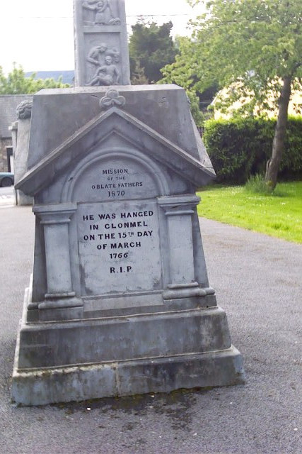 I stood outside St. Mary’s Church of Clogheen, studying the monument built to Father Sheehy’s memory in 1991. Each side had symbolic reliefs, which I was photographing when John Tuohy and Caspar strolled up.