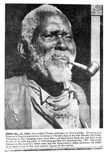 Born on Christmas Day in 1820, Mark Thrash, affectionately known as Uncle Mark, died on December 18, 1943, one week before his 123rd birthday. A short time before that, Roscoe E. Lewis, who worked collecting slave narratives with the Writers’ Project, visited him at his home at Georgia’s Chickamauga National Military Park.