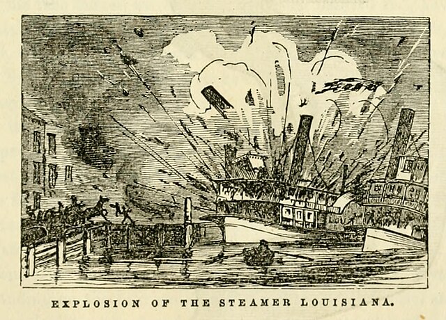 John T. Lloyd & Co, publisher, Explosion of the Steamer Louisiana 1849 in Lloyd’s Steamboat Directory 1856 , marked as public domain, details on Wikimedia Commons